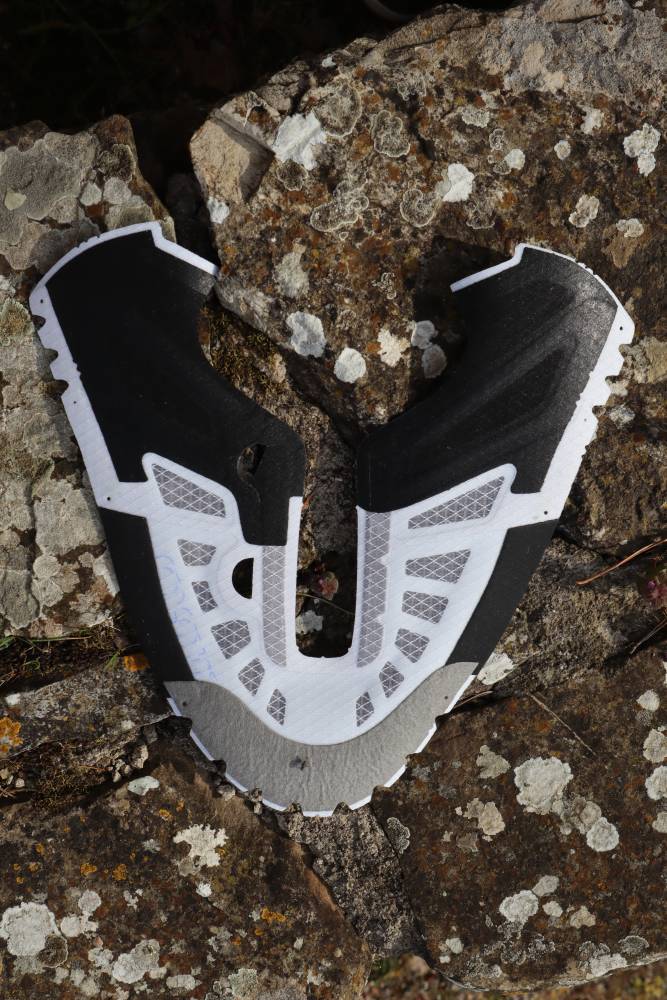 Dat ze toch zo licht zijn geworden is vooral te danken aan de upper van het nieuwe Synchwire materiaal. Dit ‘gaas’ (monofilament mesh) maakt het mogelijk de hele bovenkant uit 1 stuk te maken, waarbij er dus geen naden zijn. En ook geen drukpunten. Het Synchwire deel wordt met warmte verlijmd met een Teijin TPU (Thermoplastic Poly Urethan), waarmee een soepele maar beresterke combinatie ontstaat. Die upper zit vol met plekken waar je alleen het mesh ziet, erg goed ademend en superlicht dus. Het maakt ook dat de schoenen extreem snel drogen. Nadeel is wel dat je je sokken er doorheen ziet. Dat is niet met alle sokken een even fraai gezicht.- Het losse gaas, extreem sterk en licht