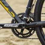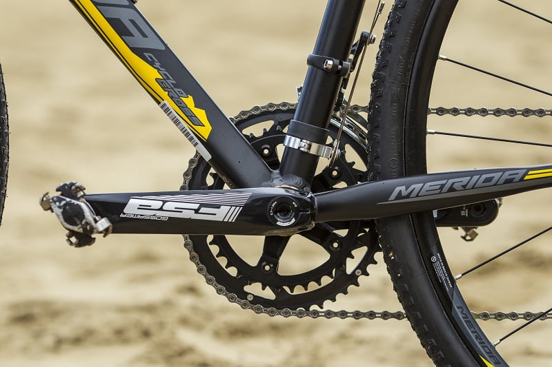 Tekst Menno Grootjans, foto’s Remco Veurink Niet de eerste keer dat we een Merida crosser met schijfremmen testen. In FIETS 10 van 2012 kwam de er een carbon Merida met Shimano Ultegra 6700 en Avid mechanische disc brakes aan bod en daarvóór ook nog een eerste aluminium model met ‘disc brakes’. Die had toen nog een inbouwbreedte van 130 mm waardoor het allemaal maar net paste. Nu lijkt het erop dat de crosser met schijfrem aan een opmars bezig is waardoor er meer componenten beschikbaar zijn. Met dank ook aan de 29er! Deze Cyclo Cross 5 D is gebouwd rond een CC Lite-D-Single frame met CC Carbon-D voorvork. Het frame weegt rond de 1700 gram, de voorvork tegen de 800 gram. De torsie stijfheid zit ruim boven de 100 Nm ( 117 Nm). Ondanks de aanlasnokken voor de disc brakes is de Cyclo Cross 5 D vrij klassiek. De buizen zijn licht geovaliseerd en oversized, de onderkant van de bovenbuis plat en de nokken van de kabels zijn boven op de bovenbuis te vinden –de kabel van de achterrem en die van de derailleurs. De lassen zijn goed zichtbaar. De balhoofdbuis is voorzien van een soort strop boven en onder. De liggende achtervorken zijn plat.