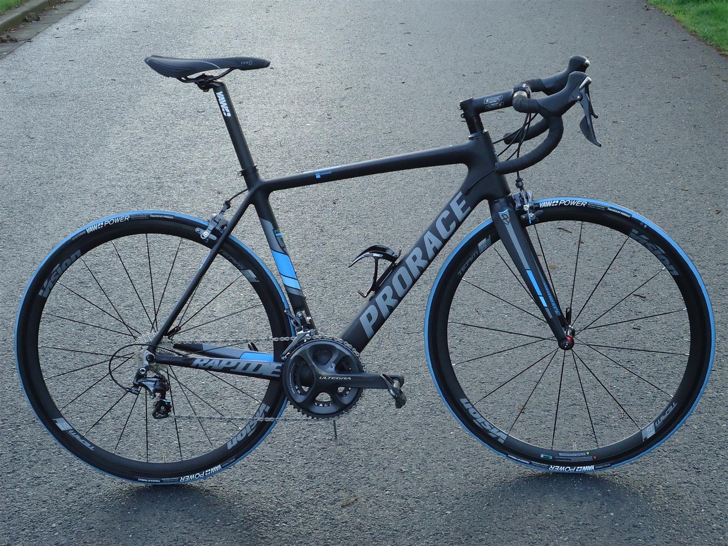 € 1599,- De Rapide is een model wat al een tijdje meeloopt. En meteen maar: nu is de Rapide in de aanbieding. Onze testfiets kost normaal rond de 2500 euro, nu is de prijs € 1599,-. En dat is dus inclusief een volledige Ultegra groep ( wil je het goedkoer: de Rapide met 105 kost slechts € 1399,-. Je hebt dan ook nog de keuze uit twee designs ( normaal levert Prorace haar fietsen in meerdere designs, maar dat gaat niet voor deze Rapide). Voor wie op zoek is naar een strakke carbon fiets met een goede prijs-kwaliteit verhouding is dit zeker een goede keuze. Dat zullen we even uitleggen. Het frame: materiaal is carbon, de maatvoering gaat van XS tot XXL. De voorvork is ook van carbon, met een aluminium balhoofdbuis. De Rapide heeft interne kabels en een pressfit bracket. De staande en liggende vorken zijn licht ‘bended’, de boven- en onderbuis oversized en geovaliseerd. Gewicht: een L weegt 1150 gram, de voorvork 500 gram en de torsiestijfheid is ruim 100 Nm. Prima. 100 % Ultegra Shimano Ultegra zoals gezegd. 50/34 crankstel, 11-28 achter. Vision alu wielset met 35 mm hoge velgen, Prorace banden en delen en een Selle Royal zadel. De complete fiets weegt 8,10 kilo. Geometrie: 73, 0 ° balhoofdhoek, 73, 0 ° zithoek, bovenbuis lengte 550, wielbasis van 990, stack 573, reach 385. Vrij allround, niks meer aan doen. Zeker voor een alleskunner! Chique