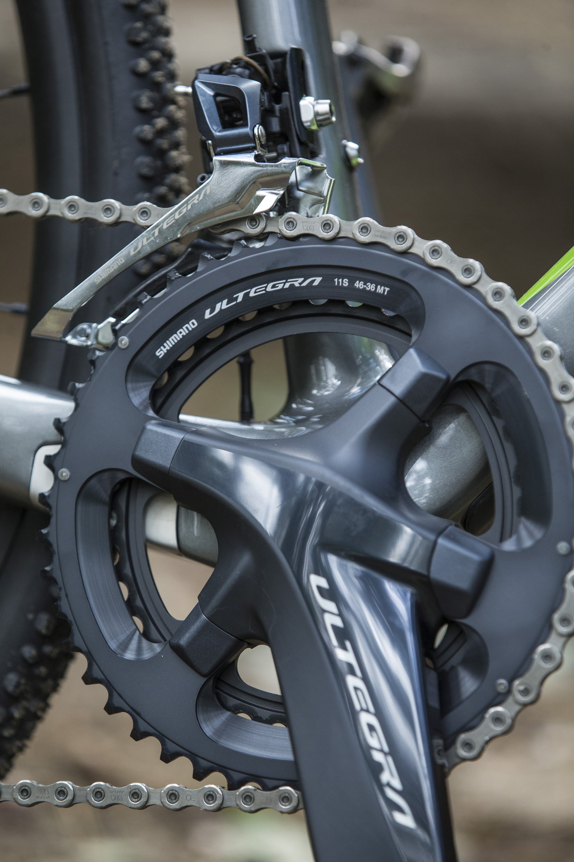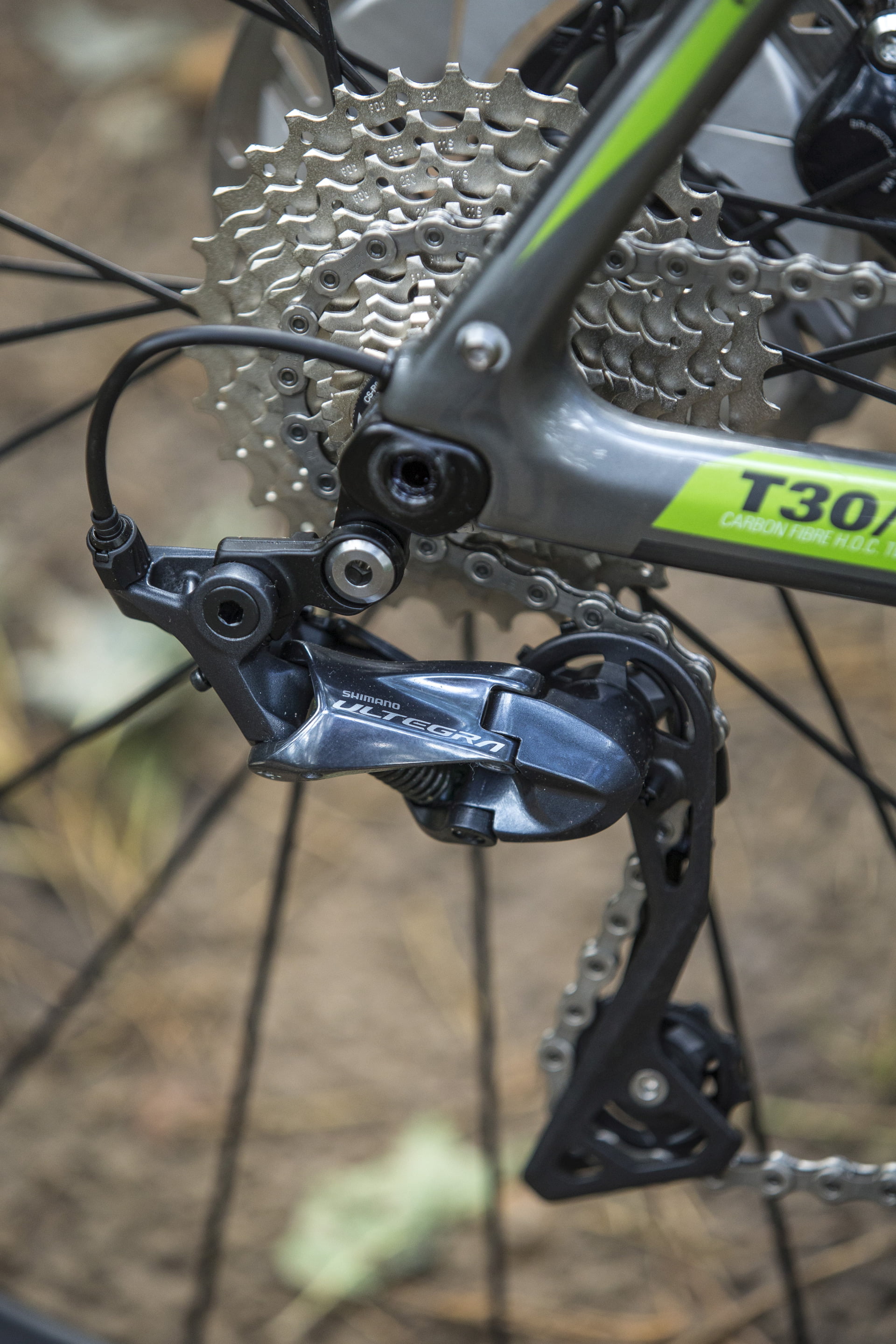 Onze fiets is er in een Cross uitvoering. Zichtbaar is dit in een Shimano Ultegra 8000 aandrijving en 33 mm Schwalbe G-One banden (Bite voor en Allround achter) om een DT Swiss wielset. En met een echte cross overbrenging: 46/36 voor en 11/32 achter. Overigens: Rose biedt de keuze uit vijf cassettes en je kunt ook voor 50/34 voor kiezen. Maar ga je echt crossen en rijd je ‘dubbel’ dan is een ‘46’ als grootste eigenlijk nog steeds het beste. En crossen? Dat wil wel met de Xeon – die wil heel graag rechtdoor. De delen (stuur en stuurpen) komen van Ritchey, waarbij de eigen Rose zadelpen van carbon is.
