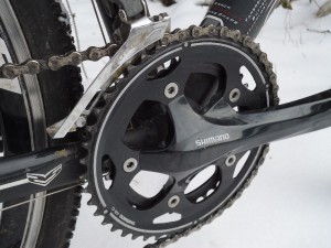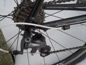 De voorvork is zwaar en blijft zwaar. De Fermo voelt daardoor niet als een hele lichte crosser. Dat is nu eenmaal zo. Maar als je dit ‘door’ hebt dan kun je genieten van de Fermo. We zijn de Fermo gaan waarderen. En dan vooral op zijn sterke punten. De kwaliteit van de onderdelen staat buiten kijf en het frame is een voorbeeld van robuustheid. Het stevige aluminium blijft ook heel netjes, de lak vertoonde ook geen sporen van winters gebruik. Gewoon wassen en droogmaken met een doek, de ketting een spray olie en dan is die weer klaar voor gebruik. Wat hebben we er aan gedaan? Een stel nieuwe remblokken –gewone, standaard blokken van een paar euro; ze slijten toch…. Een iets kortere stuurpen en een –gebruikt- Arione zadel. Verder af en toe een drup olie bij de ingang van de derailleur en achterremkabel en verder niet veel. Het balhoofdstel draait nog lekker rond al zouden we voor een volgend seizoen het hele spul schoonmaken en opnieuw invetten. De ketting is nog lang niet versleten, evenals de kransjes. Fijn: het Shimano cross crankstel. Ook niet licht, maar shimano/shimano schakelen is pre!