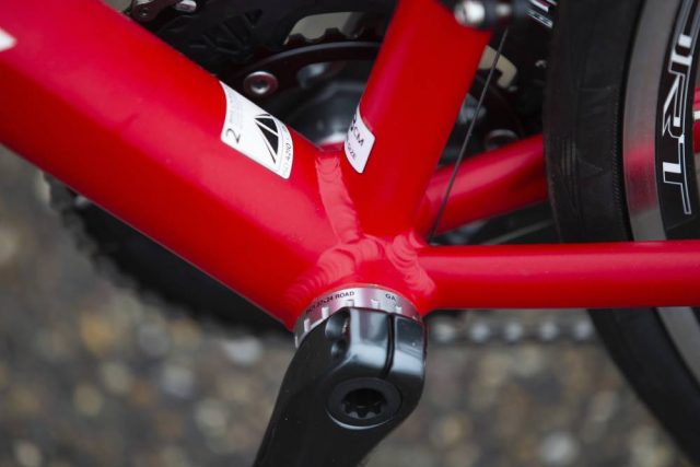 Een heerlijk frisse racer, zo in het Lightning Red. Oversized 6061 aluminium frame. Deels geovaliseerd – vooral de onderbuis en de staande buis bij het bracket, deels rond. Het bracket heeft een gewoon schroefdraad, de achtervorken zijn slank en staande achtervorken lopen vloeiend over van de bovenbuis naar de achterpatten.