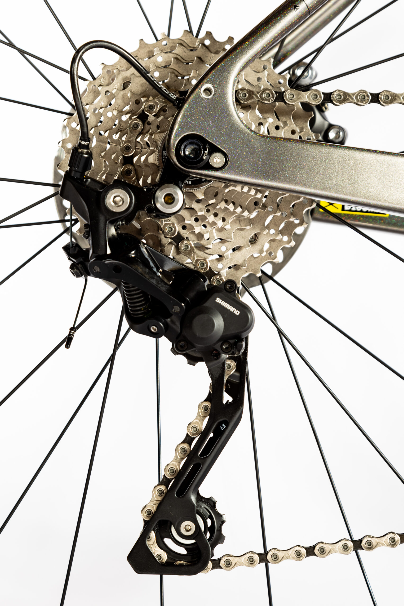 Het zadel en de zadelpen zijn van Syncros. De stuurpen en het stuur zijn van Satori – mij onbekend, maar het ziet er prima uit. De wielen hebben een naaf van BGM met Syncros Capital 2.0-velgen. De groepset: Shimano GRX, natuurlijk met hydraulische schijfremmen (voor en achter 160 millimeter). De banden die erop zitten zijn van Schwalbe, G-One Bite om precies te zijn. En zelfs met deze 45 millimeter brede exemplaren houd je nog ruimte over. Het geheel zorgt ervoor dat dit bepaald geen lichtgewichtfiets is, met 10,3 kilogram (en dat is nog zonder pedalen).