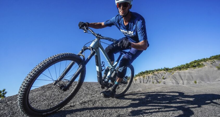 Wanneer we de vork ‘lui’ instellen voelt het geheel bergaf nóg stabieler maar verdwijnt ook het laatste restje speelsheid. Daarover gesproken: het speelsere, kleinere 27,5 inch achterwiel wisselen we al gauw in voor een snellere 29 inch carbon variant plus bijbehorend voorwiel met (veel) beter plakkend Pirelli-rubber. De Bontrager banden zijn stug en rollen niet al te best. Dat kan beter. De full 29’er-setup voelt duidelijk prettiger en sneller, zeker wat de snelheid betreft is de fiets zo meer in zijn element. Eenmaal op snelheid is afremmen soms een dingetje: de standaard Shimano-remmen op deze aluminium versie voelen vrij sponzig wanneer een run langer duurt dan enkele minuten. Na het upgraden van de schijven voelt het al een stuk beter.