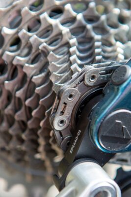 De voorderailleur uit de oude groepset was nog weleens een lastpak. De afstelling luisterde heel nauw. Zat je er net naast qua afstelling, dan kwam de ketting soms tussen twee bladen terecht of vloog over het buitenblad. Met de nieuwe derailleur is dat verleden tijd. Deze is nauwer en dankzij meegeleverde montagetools is afstellen ook een eitje. Hij ‘trimt’ trouwens automatisch. Als je achter schakelt, schuift de ‘voorderrie’ een beetje mee om aanlopen van de ketting bij een schuine kettinglijn te voorkomen.