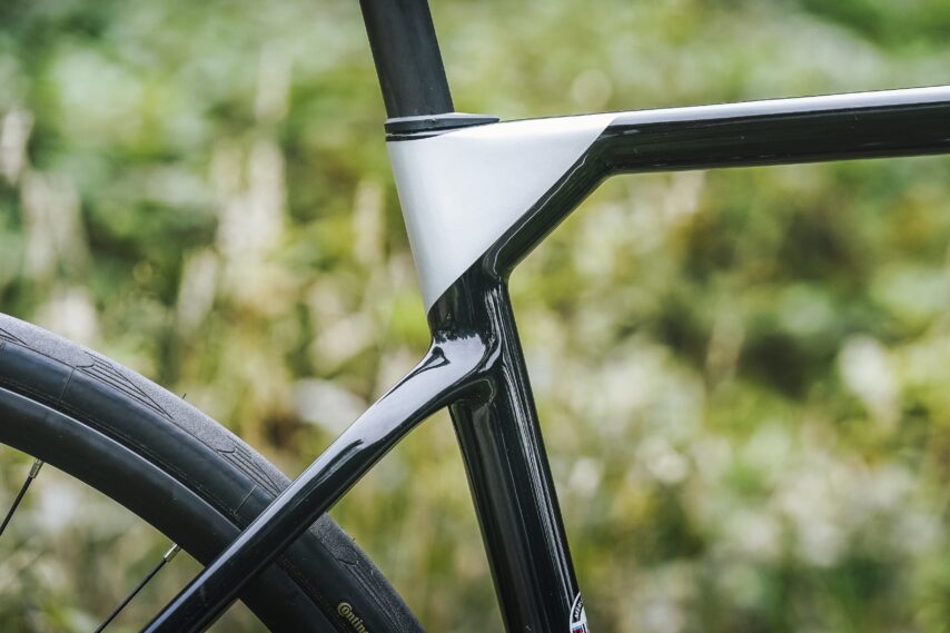 Het aantal Scultura-uitvoeringen is de laatste jaren flink toegenomen. Er zijn aluminium en carbon modellen. Dit is de 4000, opgebouwd rond een CF3 V-frame. De samenstelling van het carbon is anders, maar verder is het CF3 Vframe identiek aan de duurdere en lichtere CF5 V, die we zien vanaf de Scultura 9000. De aero-invloeden merk je aan de D-vormige onderbuis, de uitsnede in de staande buis voor het achterwiel, de vorm van de voorvork en de staande achtervork. De Scultura 4000 is er in zes maten. Deze uitvoering, met Shimano 105 7100 12-speed, weegt 8,7 kilo.