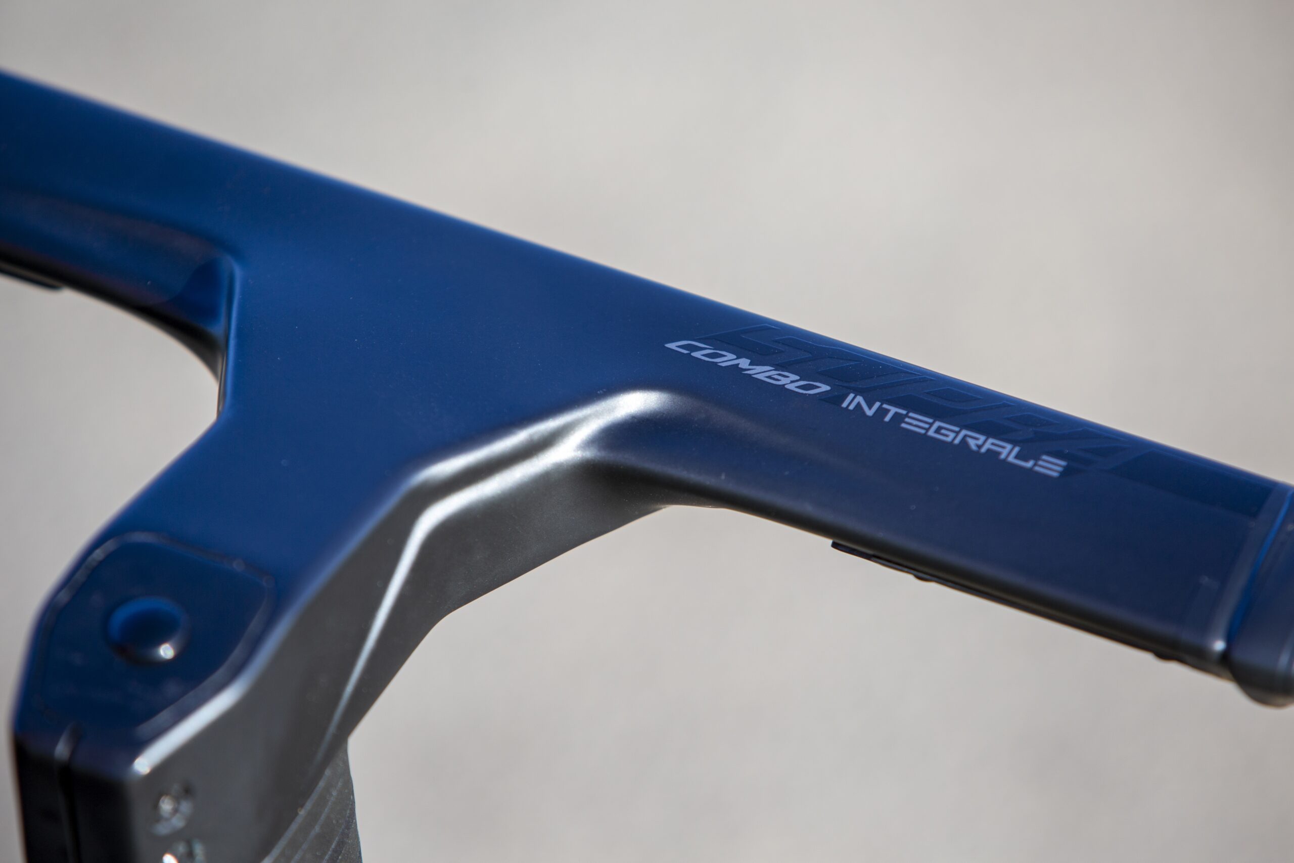 De kabels zijn netjes weggewerkt, de cockpit uit eigen huis is erg stijf en de aerodynamische lijnen ogen strak. Kijk maar eens naar de achtervork, die in een vloeiende lijn overloopt in de bovenbuis: alsof het uit één stuk gegoten is. De robuuste onderbuis en staande zitbuis maken het geheel af. De matzwarte lak van de Giulia Evo doet denken aan die van een stealthstraaljager. Zo’n hypermoderne jet is als het goed is onzichtbaar, maar dat ben je op de Giulia Evo (gelukkig) niet. Want dit is een opvallende verschijning.