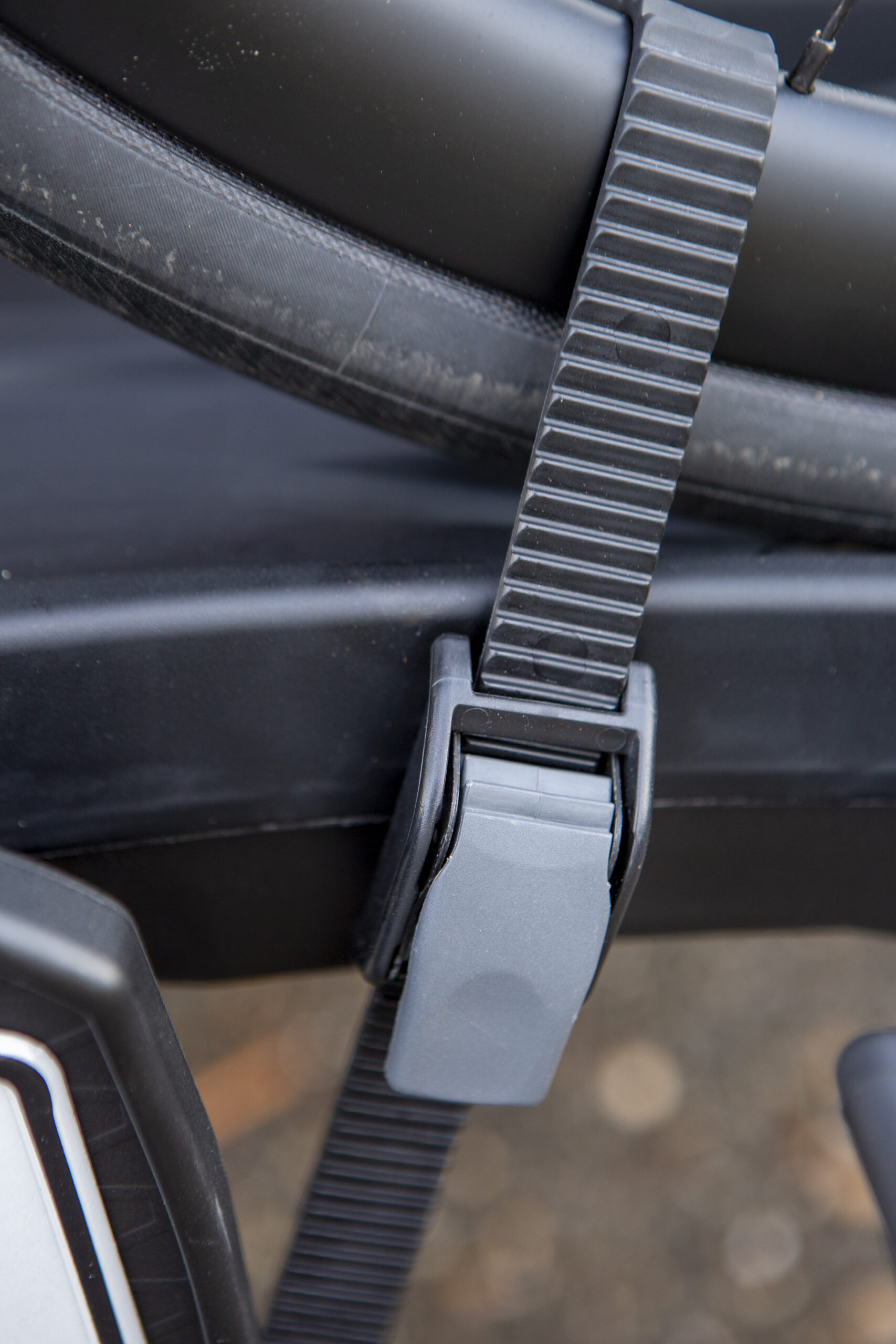 Hier geen staande steun in het midden, maar boven de trekhaak. Niet in hoogte verstelbaar, is ook niet nodig bij dit systeem. De klem waarmee je hem op de auto vastzet werkt soepel, plaatsen is daarmee een makkie. Net als bij de Spinder zijn de wielhouders verstelbaar, waarmee je voor iedere wielbasis een goede passing kunt maken. Als je altijd dezelfde fiets op dezelfde plek zet, hoef je hier maar een keer aan te zitten.
