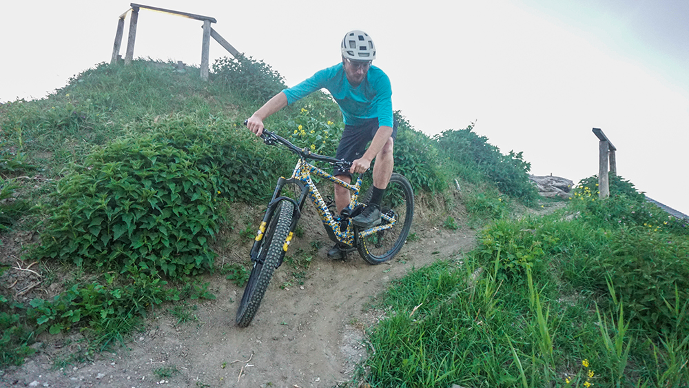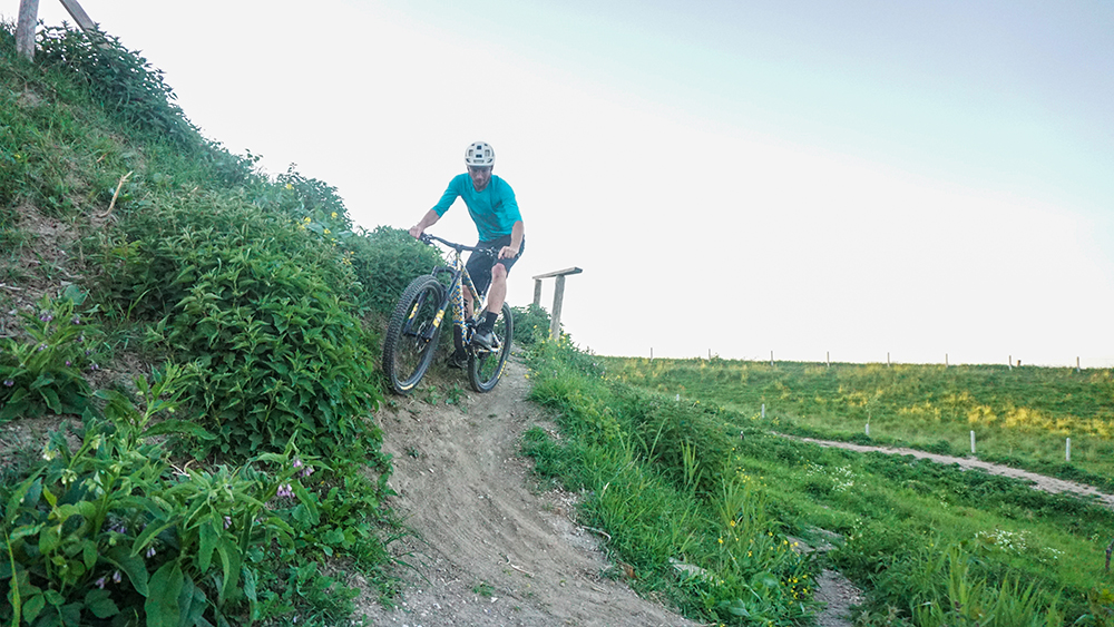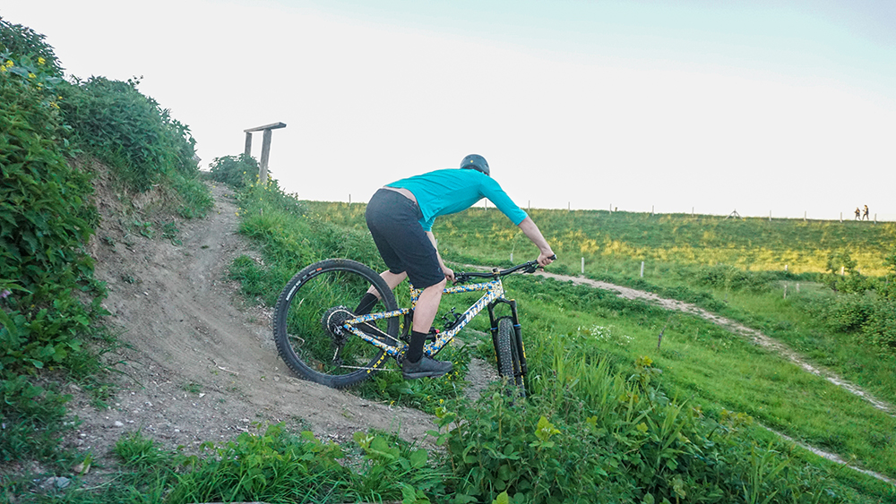 Wederom is het belangrijk eerst het pad te scannen. Een switchback zoals in dit voorbeeld is op verschillende manieren te nemen. Bijvoorbeeld door je gewicht naar voren te verplaatsen en het achterwiel in de lucht om te zetten. Deze ‘next level’ technieken besparen we je. We houden vandaag de voetjes aan de grond.