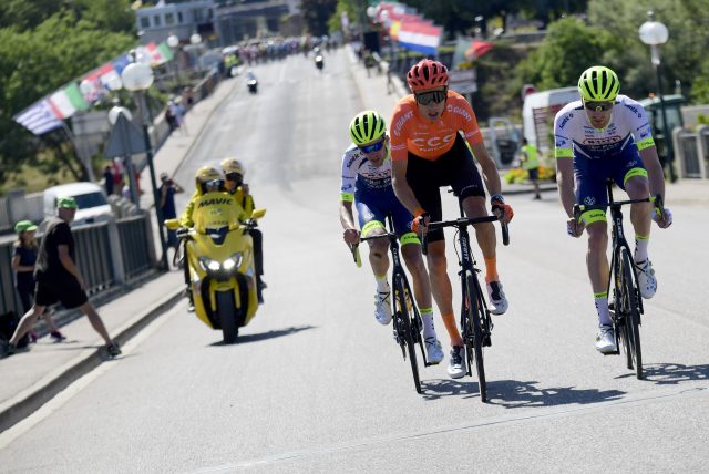 De drie koplopers. Er werd gevallen in de grote groep, maar – zoals dat zo mooi heet – zonder erg. De drie reden samen lange tijd aan de leiding, maar met nog minder dan twintig kilometer te gaan werd ook Schär als laatste aanvaller gegrepen door het peloton. Met nog één hindernis voor de boeg leek een massasprint onvermijdelijk. BORA-hansgrohe en Sunweb reden op de Côte de Maron (4de categorie) nog stevig door en trokken het peloton op een lint, maar tot breuken leidde het niet.