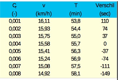 Ook zien we heel duidelijk het effect van een slecht wegdek op de haalbare tijden (tijdverlies van 171 seconden bij een cr van 0,008).