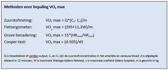 rust hebben. De tweede methode wordt veel gebruikt en bestaat uit het meten van de afstand die een persoon in 12 minuten kan afleggen (de Cooper test). Met de afgelegde afstand kan de VO