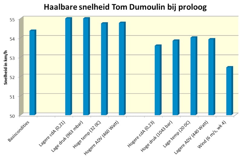 Het resultaat van de berekening is dat Dumoulin bij de proloog een snelheid kan halen van 54,36 kilometer per uur. Als de hittegolf ertoe leidt dat de temperatuur tijdens de proloog oploopt tot 32 graden Celsius, is zelfs een snelheid van 54,74 kilometer per uur mogelijk. Dit betekent dat we voorspellen dat hij een tijd gaat rijden van 15:18 (inclusief 10 seconden verlies voor de start en de bochten). Welke factoren kunnen het resultaat beïnvloeden? Bij ons eerdere artikel over het werelduurrecord hadden we al gezien dat de temperatuur en de luchtdruk een grote invloed kunnen hebben. Bij een parcours in de open lucht kan de wind uiteraard ook flink mee- of tegenblazen. En tenslotte is de vorm van de dag natuurlijk van groot belang: kan Tom het vermogen van 494 Watt inderdaad halen en is hij in staat met een perfecte stroomlijning te fietsen? De onderstaande figuur laat zien hoeveel effect deze factoren hebben op de haalbare snelheid voor Tom. We zien dat vooral de wind er flink in kan hakken!