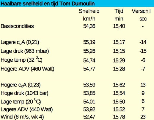 Samenvattend kunnen we concluderen dat de invloed van de cdA, luchtdruk, temperatuur en het vermogen allen in de orde van plus of min 10 seconden liggen. De belangrijkste factor is de wind, die makkelijk tot een verlies van 20 seconden of meer kan leiden.