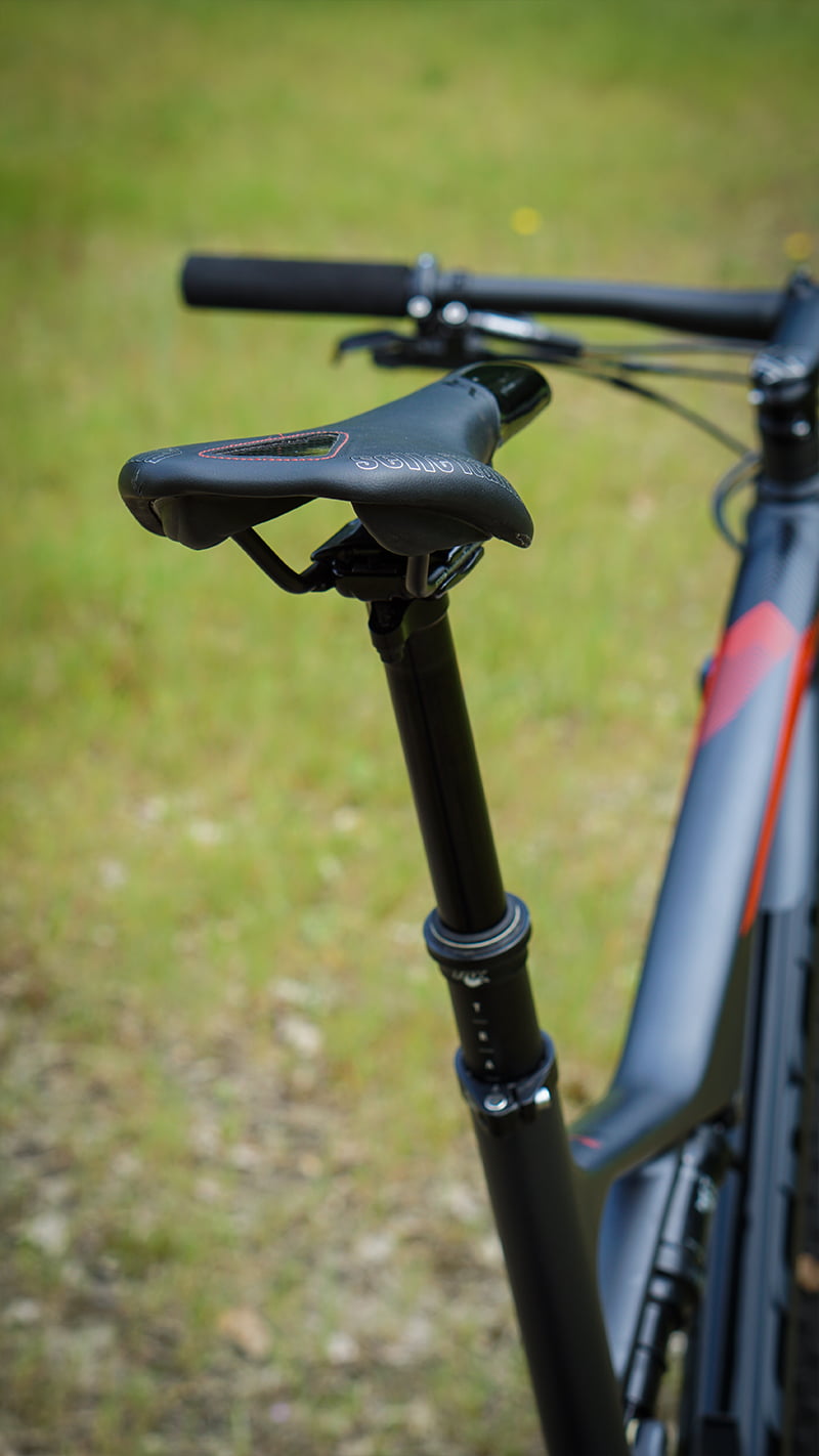 Onze testfiets is uitgerust met de optionele Fox Transferdropper, die we al kennen uit andere fietsen. Deze dropper werkt erg prettig en zeer soepel. Wel zouden we adviseren de cockpit te tunen. De lock-out knop van de vork/demper kan ook linksboven in plaats van onder het stuur waardoor er plaats vrijkomt voor een veel prettiger te bedienen shifter voor de dropper linksonder. De nu gebruikte hendel aan de rechterkant is gevoelig voor vuil en alleen goed bereikbaar als je de handen hebt van een Noord-Hollandse aardappelteler.